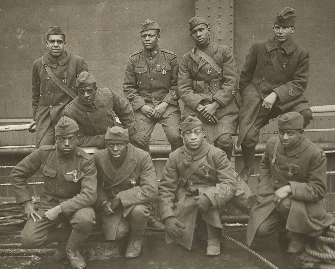 While in combat, the 369th earned a reputation as gallant fighters. As noted at the beginning, Needham Roberts and Henry Johnson earned fame in May 1918 when they repulsed a German raiding party despite receiving serious wounds and expending their ammunition. The two men earned the French Croix de Guerre for valor, but the U.S. Army ignored their achievements for decades (Johnson did eventually earn a Distinguished Service Cross, which the Army upgraded posthumously to the Medal of Honor in 2015). The press, however, spread their story in both France and the United States. Johnson earned the nickname “Black Death,” and the 369th collectively earned the moniker “Harlem Hell Fighters.” After 191 days in action, the New Yorkers served as the advance guard for the 161st French Division, and one week after the armistice, the Harlem Hell Fighters became the first Allied regiment to reach the Rhine River, on the border of France and Germany near Blodelsheim.