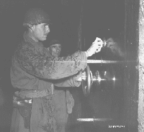 Corporal Dolald Ornitz examines painting in underground vault. (NARA-111-SC-2374692)