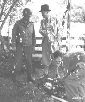 SS Major Baron Haller Von Hallerstein admitted that he had buried nearly a million dollars worth of securities and jewelry near Garmisch, Germany. Hallerstein (center) watches with Tec4 Frederick Wolinshy, New York, NY, as his brother, Helmuth Baron Haller Von Hallerstein, digs. May 25, 1945. (NARA-111-SC-380425)