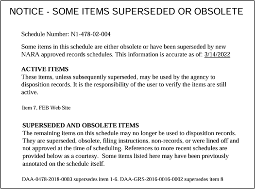 If NARA has reviewed your agency’s Record Group, you will see schedules marked as “Inactive.” These are schedules that NARA has already identified as fully superseded or no longer in use.