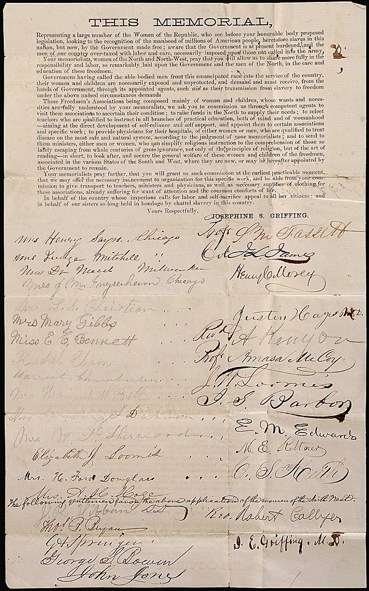 Memorial written by Josephine Griffing asking that women be commissioned to assist with the care and education of the freedmen |