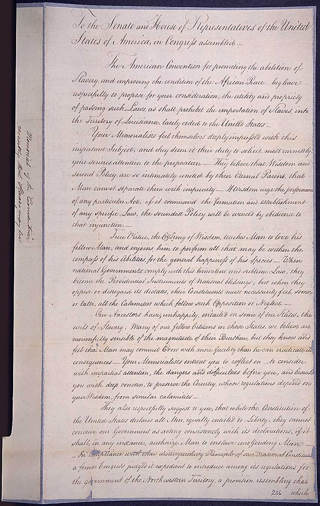 | Select Committee | HR8A-F5.5 | Memorial from the American Convention for Promoting the Abolition of Slavery, January 29, 1804, arguing against importing enslaved persons into the Louisiana Territory |