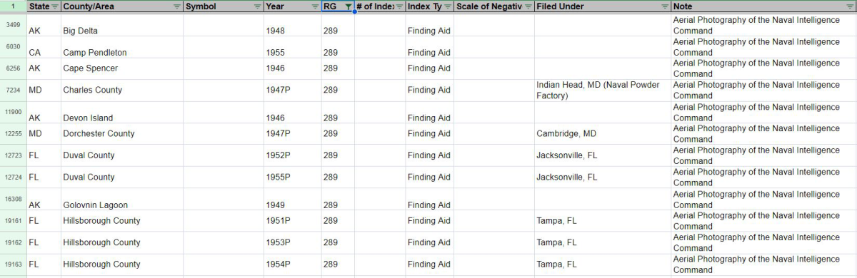 Similar to other domestic aerial photography, coverage can be searched by state and county in Special List 25 Additionally, the Special List can be filtered to only show coverage in RG 289.