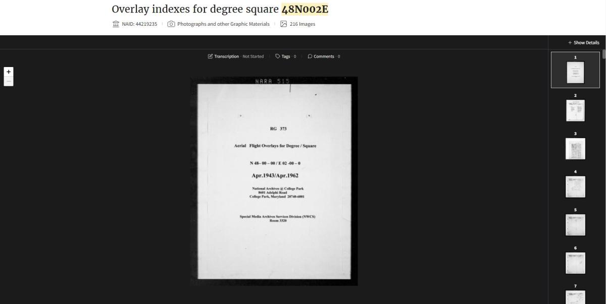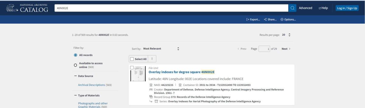 The indexes for these photographs are Overlay Indexes for Aerial Photography, 1935-1971. These overlay indexes are filed by degree square, which is an identifier used to denote a certain area by latitude and longitude. To search for a particular degree square, enter it directly into the main search bar in the National Archives Catalog as shown in the following examples. The latitude must be two digits and the longitude must be three digits (Ex: 48N002E; 56N003W).