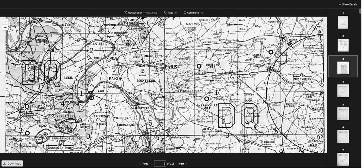 After identifying your area of interest on the map, you can search through the overlays by scrolling through the thumbnails on the right of the screen or clicking on the "Next" and "Previous" buttons below the image.