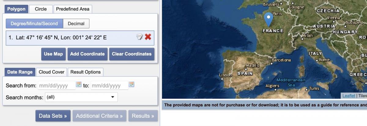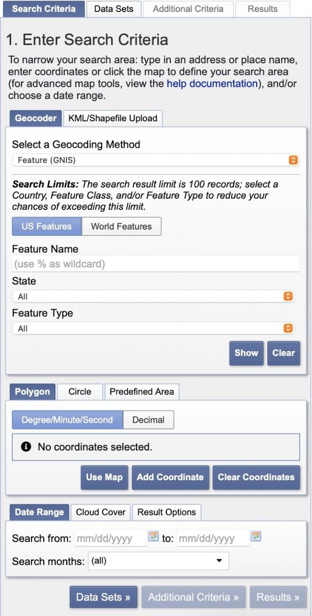 1. Search Criteria: Set your Search Criteria using the options given. You can add geographic coordinates to view all aerial coverage for your specific area. You can also add dates to search for a specific time frame.