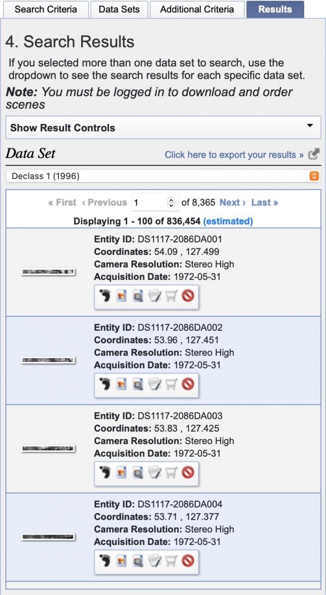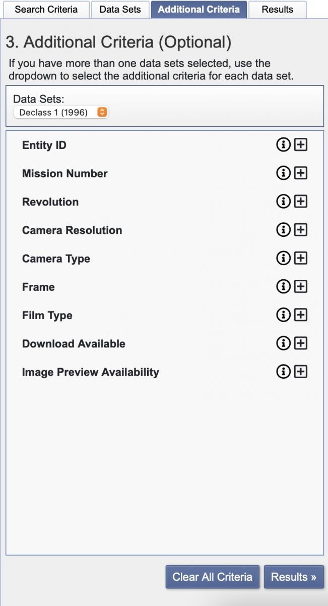 2. Data Sets: To search satellite imagery, select Declassified Data, then select one or more of the available data sets: