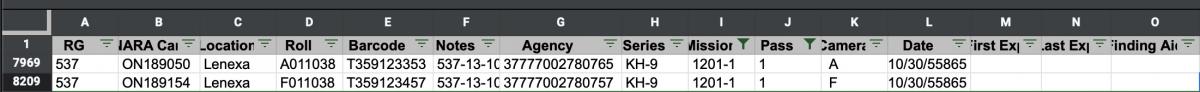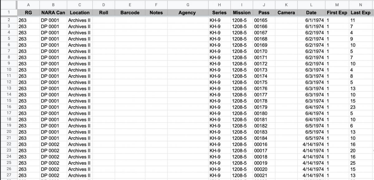 Additionally, we have spreadsheets which provide information for various KH-9 missions. These spreadsheets include the geographic coordinates for each KH-9 frame, so they can be searched by location. Although these finding aids are complicated, please do no hesitate to email us to ask for assistance at carto@nara.gov.