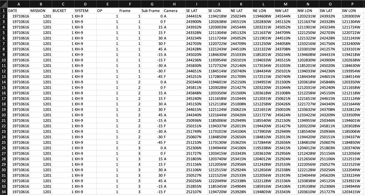 Once you locate the general area of your coordinates in the spreadsheets, the associated mission information will be listed under the “Mission,” “Bucket” and “OP” fields. You can then search the KH-9 can locator to find the available film cans that hold these images using the information from the spreadsheets or the mosaic indexes.