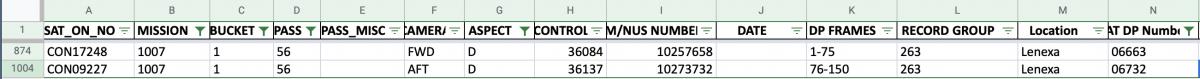 Using the information from the WAC chart, you can search the fields in the can locator to find the exact film cans that the photography is on. If missions include can numbers in the "SAT DP Number" field, this means there are duplicate cans that are available onsite. If there is only a CON can number listed, this means there are only original negatives and there are not duplicates onsite. In this case, the photographs are original negatives which are stored at the Lenexa Federal Records Center. These cans can be ordered in the Cartographic Research Room and arrive within three business days. If you already have a researcher card, you can order CON cans ahead of your visit to our site.