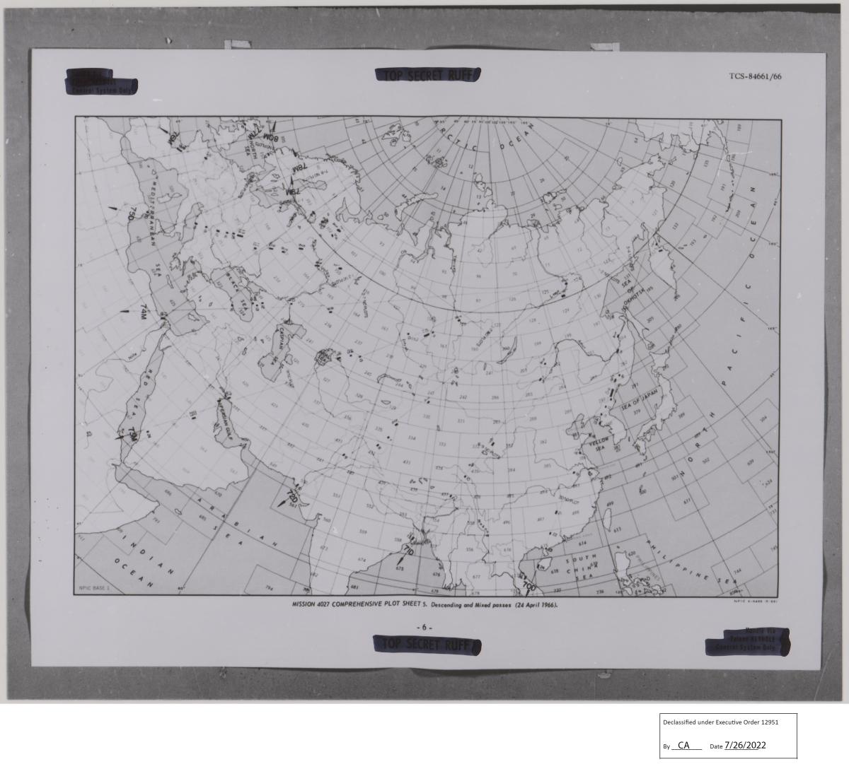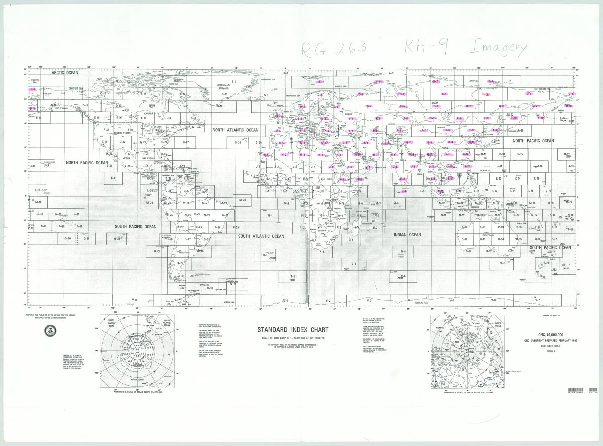 CORONA, ARGON and LANYARD satellite photography can be located by accessing indexes in the Cartographic Research Room. In our research room, we have an index that leads to charts in RG 263: Photomosaic World Aeronautical Charts, 9/1960 - 6/1972 based on your area of interest.