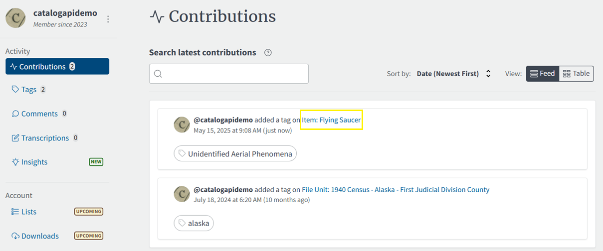Step 1: Log in to your Catalog user profile on catalog.archives.gov to see your latest contributions.