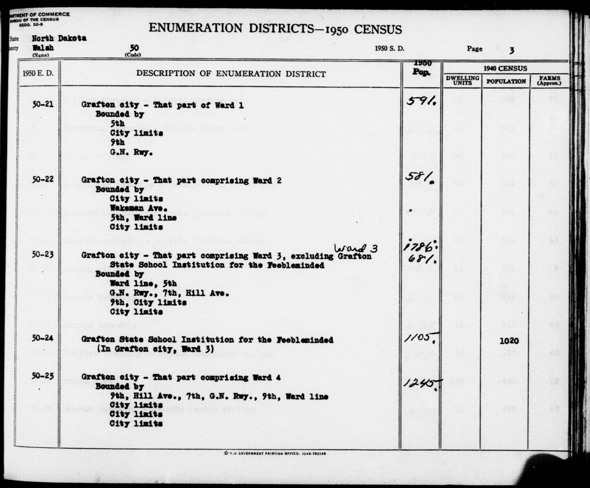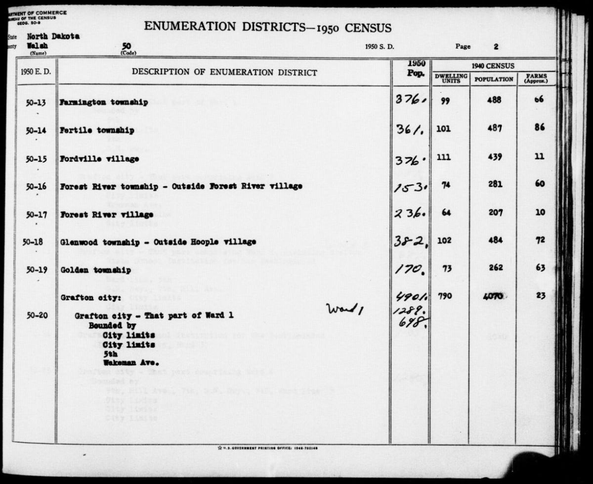 The population of Minor Civil Divisions (MCDs) for some census years can be found in descriptions of census Enumeration Districts (EDs) that were written by the Geography Division of the Bureau of the Census and its predecessors. MCDs are political units below the county level. For example, the written description of the 1950 EDs includes both population totals for the 1940 and 1950 censuses, as shown in the image below for EDs in Walsh County, ND. In the first image, note that Grafton city data is given for 1950 (4901) and 1940 (4070). The 1950 total for Ward 1 is shown (1289) followed by the total for ED 50-20 (698), which was only part of Ward 1. In the second image, we see similar data for the rest of Ward 1 and Grafton's other wards and EDs.