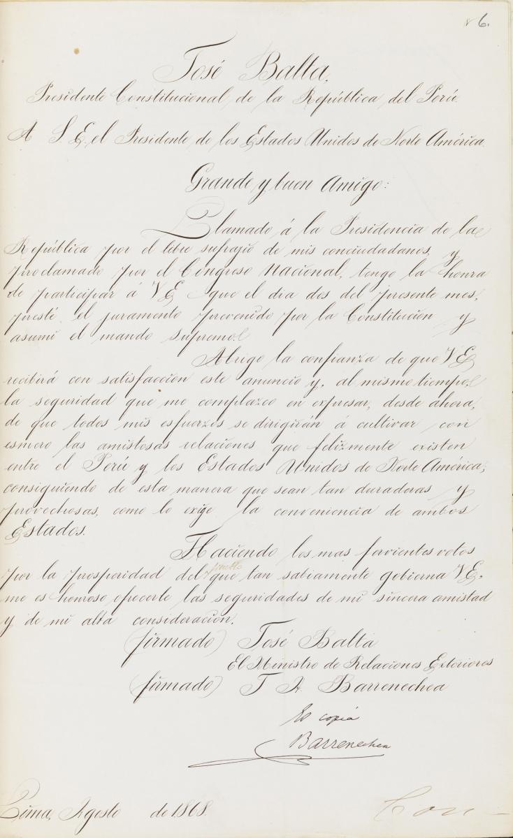 Letter from President Nicolas de Pierola to the President of the United States [William McKinley]