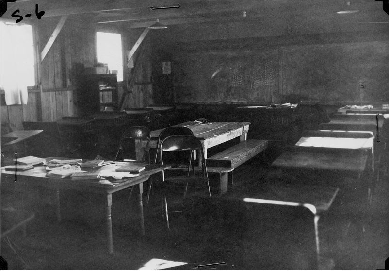 Classroom in the newest building, a war surplus building, in a labor camp in Mathis, Texas. The walls are bare, the classroom is overcrowded, and there is improper lighting.