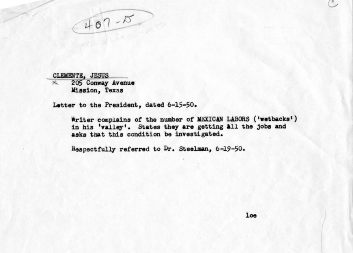 Hand written letter from farmer in Mission, Texas, to President Harry S. Truman requesting more help from the President to help Border Patrol move "wetbacks" from the Rio Grande Valley who are taking Mexican American jobsl