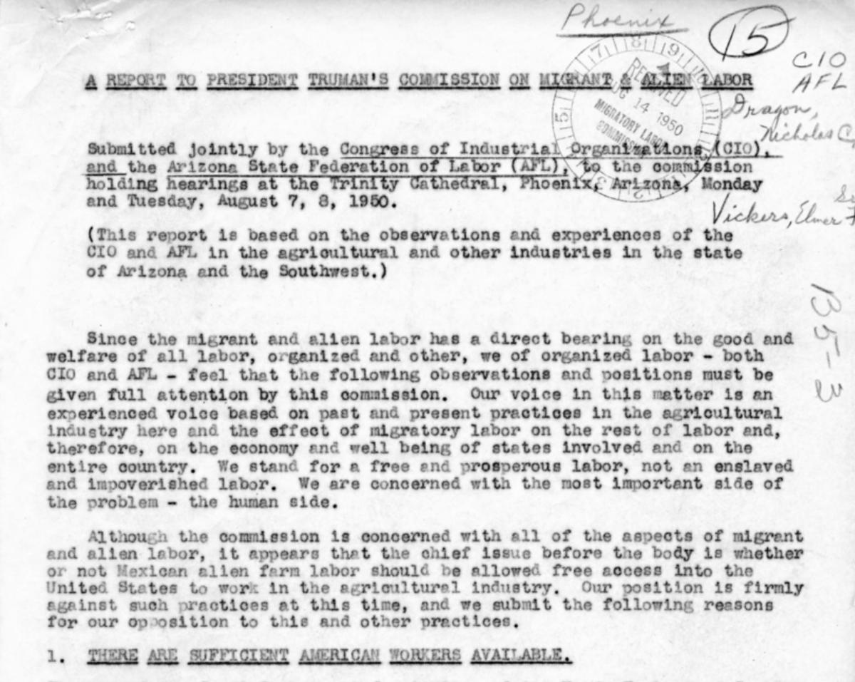 Nicholas C. Dragon, Elmer F. Vickers, et al. A Report To President Truman's Commission on Migrant and Alien Labor, August 7, 1950.