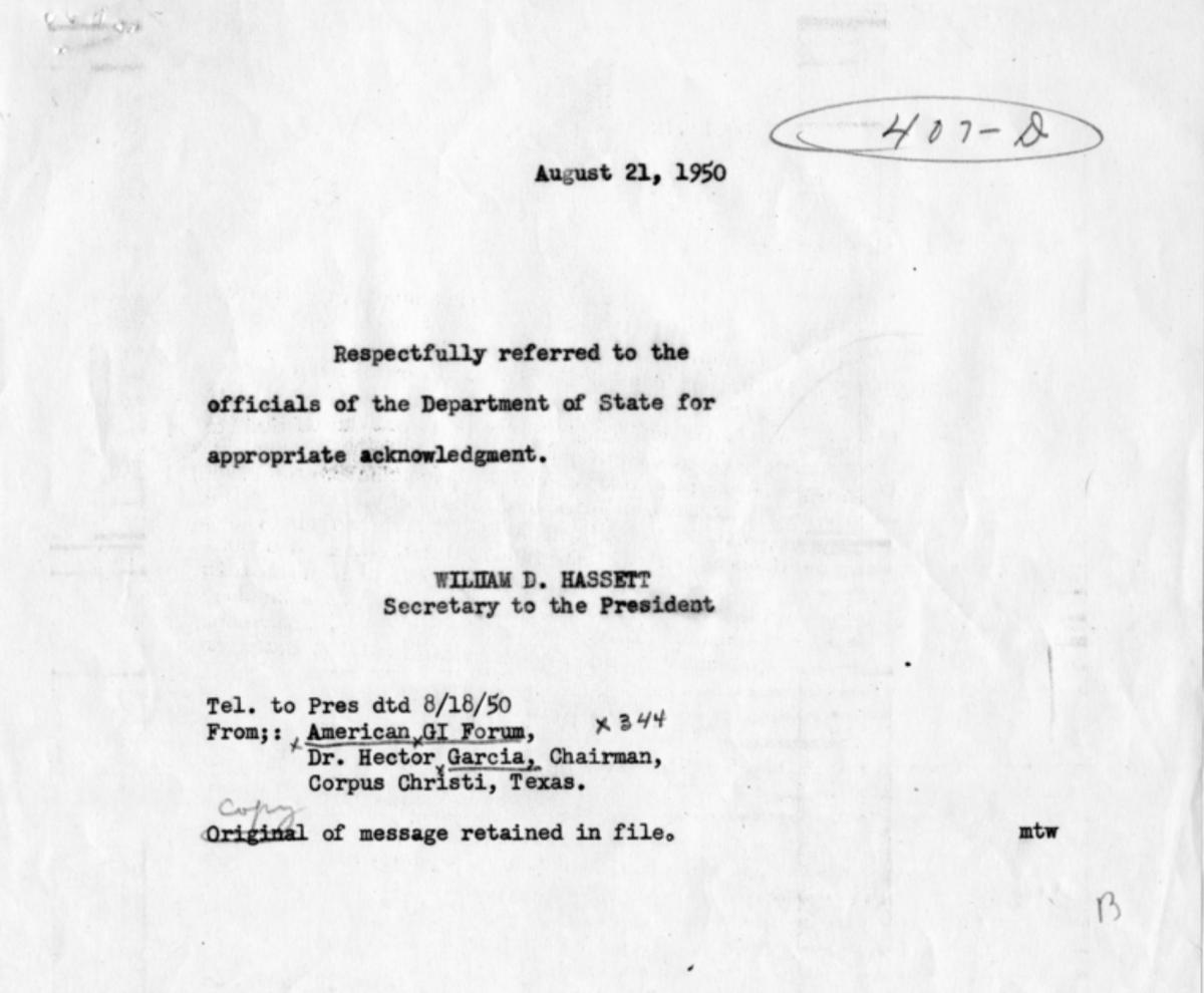 Telegram from Hector Garcia, head of LULAC to President Truman requesting end of migrant laborers from Mexico. View on Truman Library site