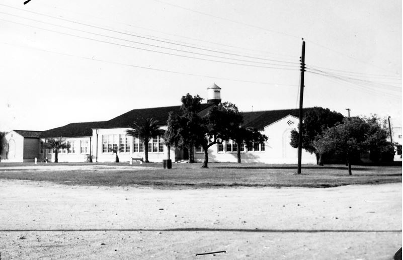Rear view of the modern and nicely kept Mathis High School outside of the labor camp in Mathis, Texas. Very few non-white students attended this school; Mexican students attended the school in the labor camp.