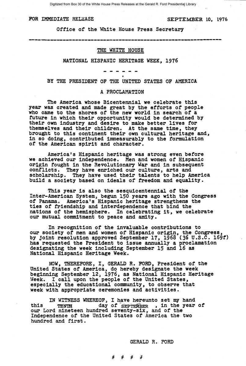 Video: President Ronald Reagan’s Remarks at a Hispanic Heritage Week Signing Ceremony in the East Room, September 10, 1984. Collection: Records of the White House Television Office (WHTV) (Reagan Administration). Length is 10:40.