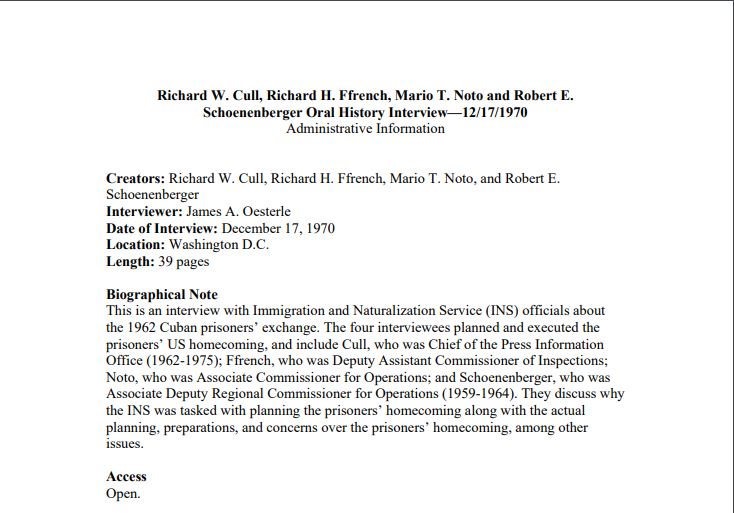 Interview with Immigration and Naturalization Service (INS) officials about the 1962 Cuban prisoners’ exchange. The four interviewees planned and executed the prisoners’ US homecoming, and include Cull, who was Chief of the Press Information Office (1962-1975).