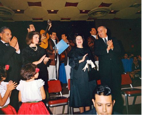 First Lady Jacqueline Kennedy, Vice President Lyndon B. Johnson, and Lady Bird Johnson applaud during a dinner held by the League of United Latin American Citizens (LULAC) at the Rice Hotel in Houston, Texas. Past National President of LULAC, George Garza.