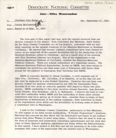 Materials collected by the office of President John F. Kennedy's secretary, Evelyn Lincoln, concerning the weekly activities of the Democratic National Committee (DNC), includes material on Mexican-American voters in California and Texas