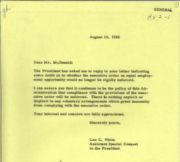 Materials in this folder include telegrams, memoranda, and correspondence between President John F. Kennedy, Assistant Special Counsel to the President Lee C. White, various White House staff members, and individual citizens concerning incidents of discriminatory employment practices.