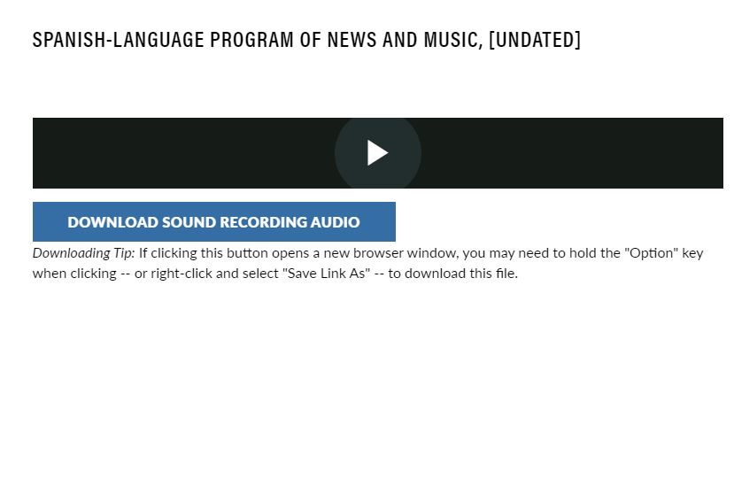 Sound recording of an undated Spanish-language Voice of America (VOA) radio program of news and popular music ["Moonglow," "Marie (The Dawn is Breaking)," and instrumentals]. Accession MR-1965-089.