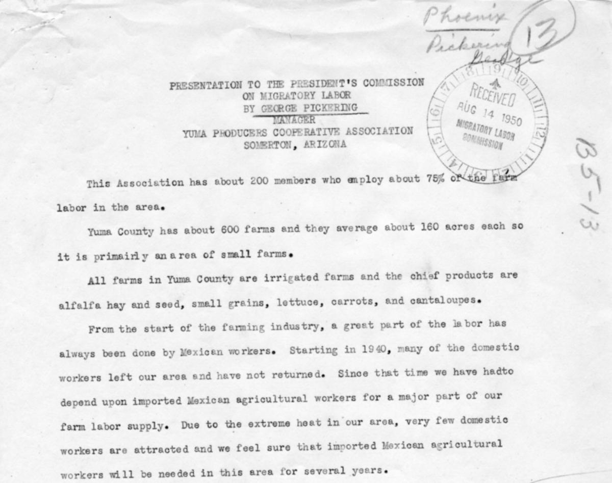 Testimony from Agricultural Producer from Yuma, Arizona to President's Commission on Migratory Labor.