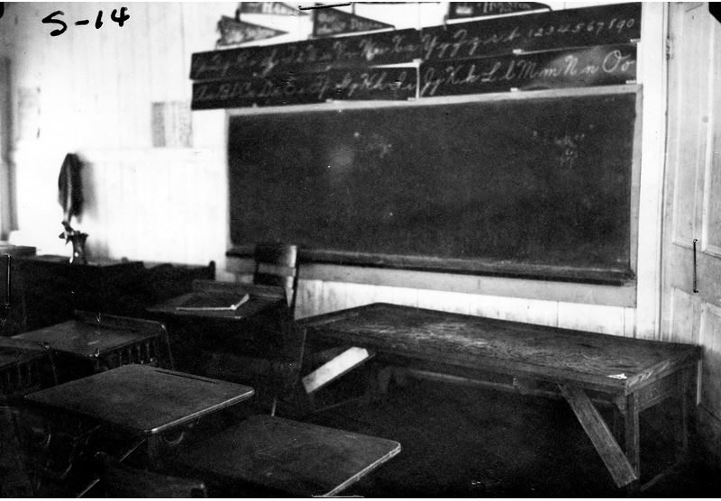 Classroom in the Main building of the Mexican Ward School in a labor camp in Mathis, Texas. Notice the blackboard is the only thing on the wall, the study table is homemade and inadequate, and the alphabet is backwards.