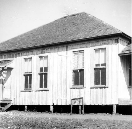 Side view of the ramshackle Mexican Ward School in a labor camp in Mathis, Texas.