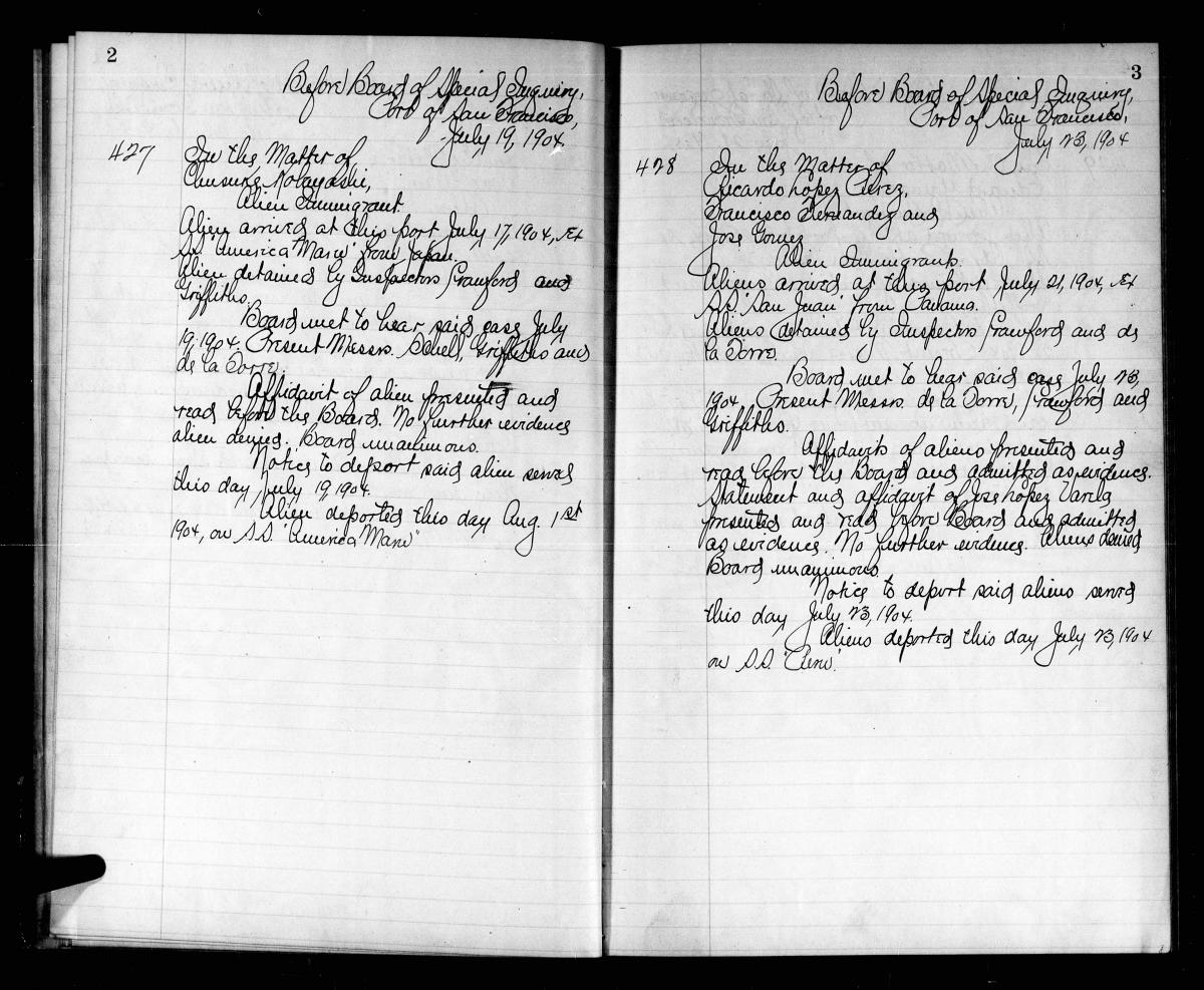 The Immigration Act of 1893 (27 Stat. 569) revised this procedure by establishing Boards of Special Inquiry (BSIs) to review each exclusion case. These boards consisted of three Immigration Inspectors who heard testimony and accepted evidence in excluded immigrants’ cases. During these hearings, immigrants usually had the opportunity to explain their situation and the reasons why they should be admitted. Initially, all three members of the board had to agree to admit an excluded immigrant for that immigrant to be allowed into the United States; later, this provision was amended so that the majority of the board (two of three members) could admit an immigrant. If the BSI upheld the exclusion, the immigrant was deported. Subsequent immigration acts, including the Immigration Act of 1917 (39 Stat. 874, Sec. 17), further codified BSIs’ authority over exclusion and deportation procedures.
