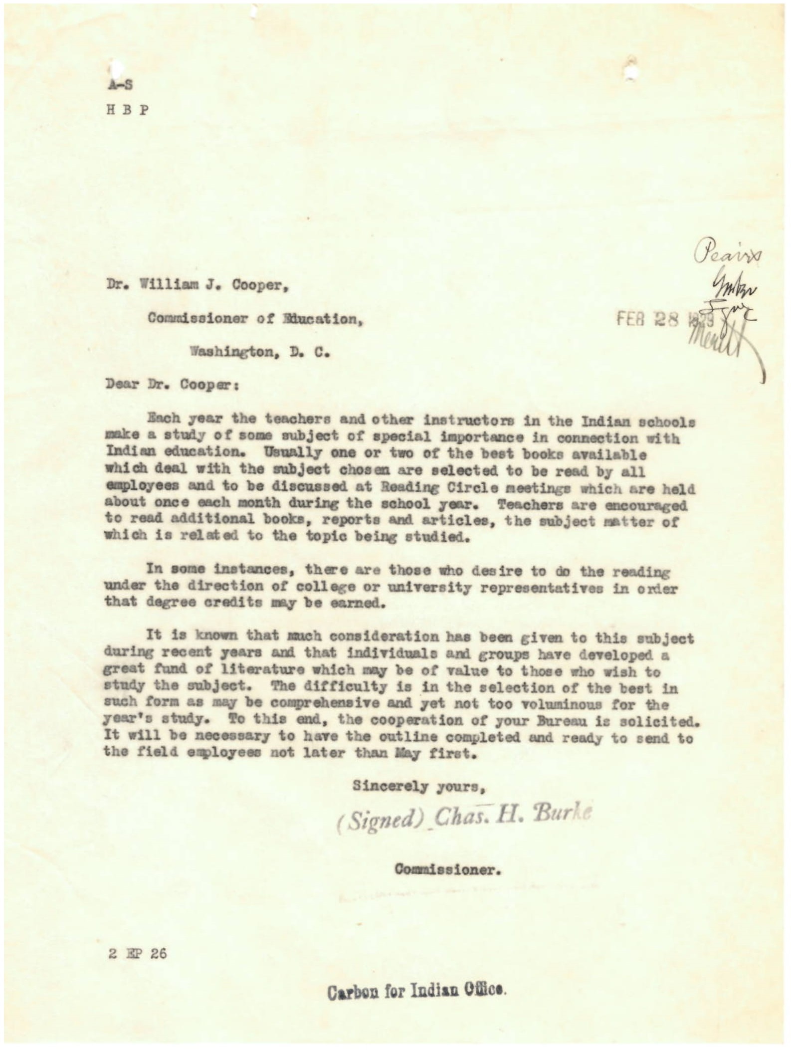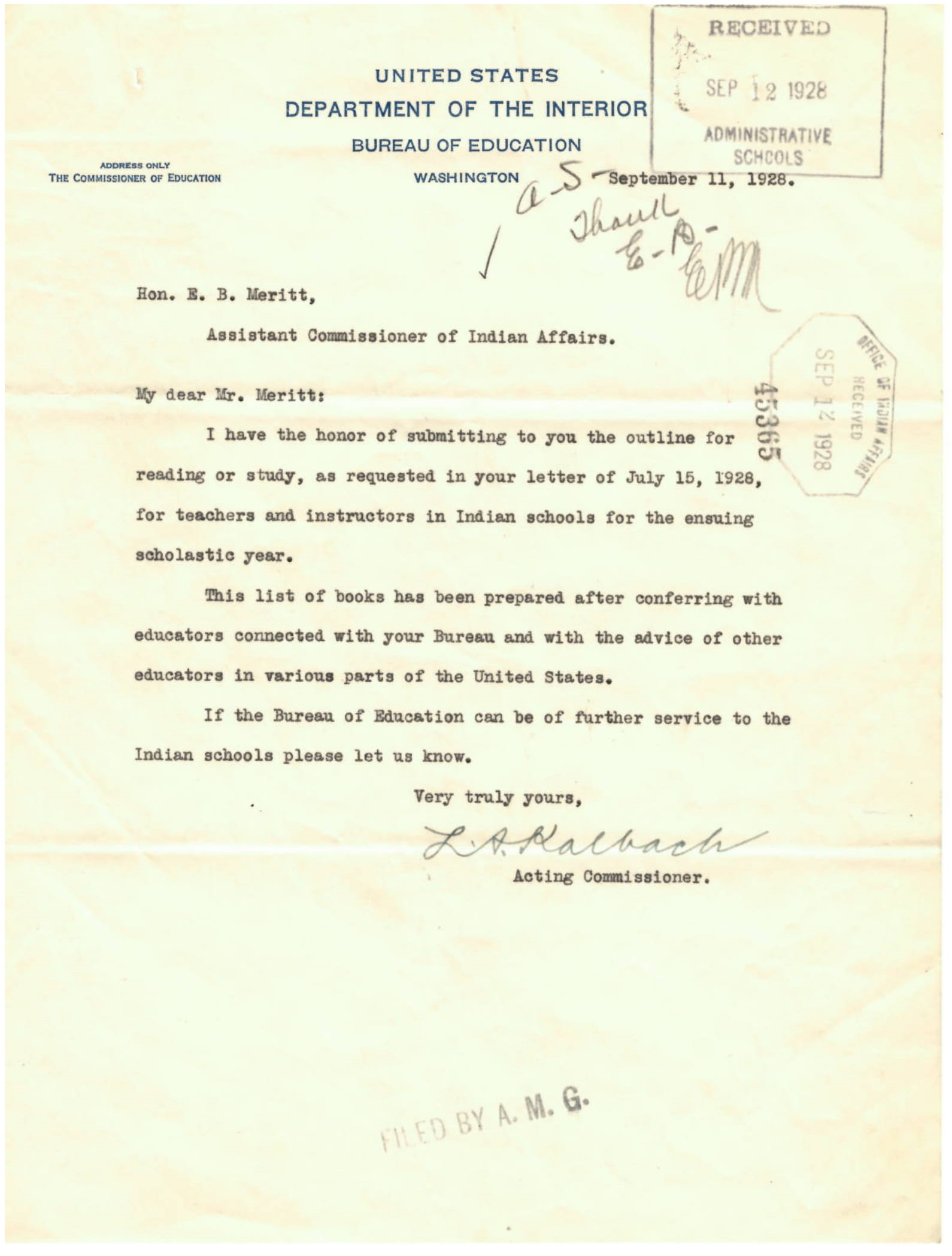 However, the summary of the letter references a reading outline for teachers in Indian schools. This summary suggests that the file does not relate to a single teacher or school, but to multiple ones. Researchers should look in the General Services category for the file.