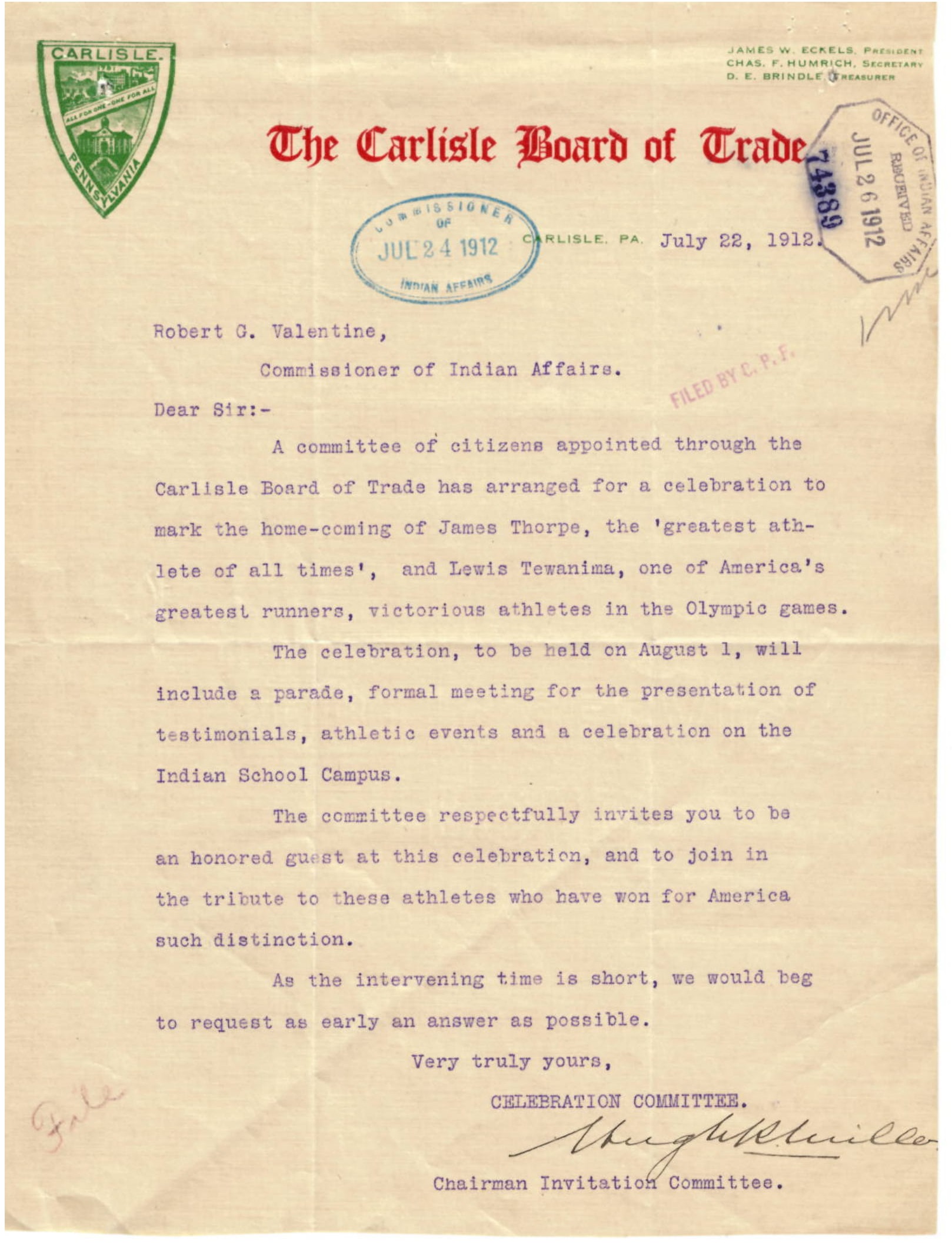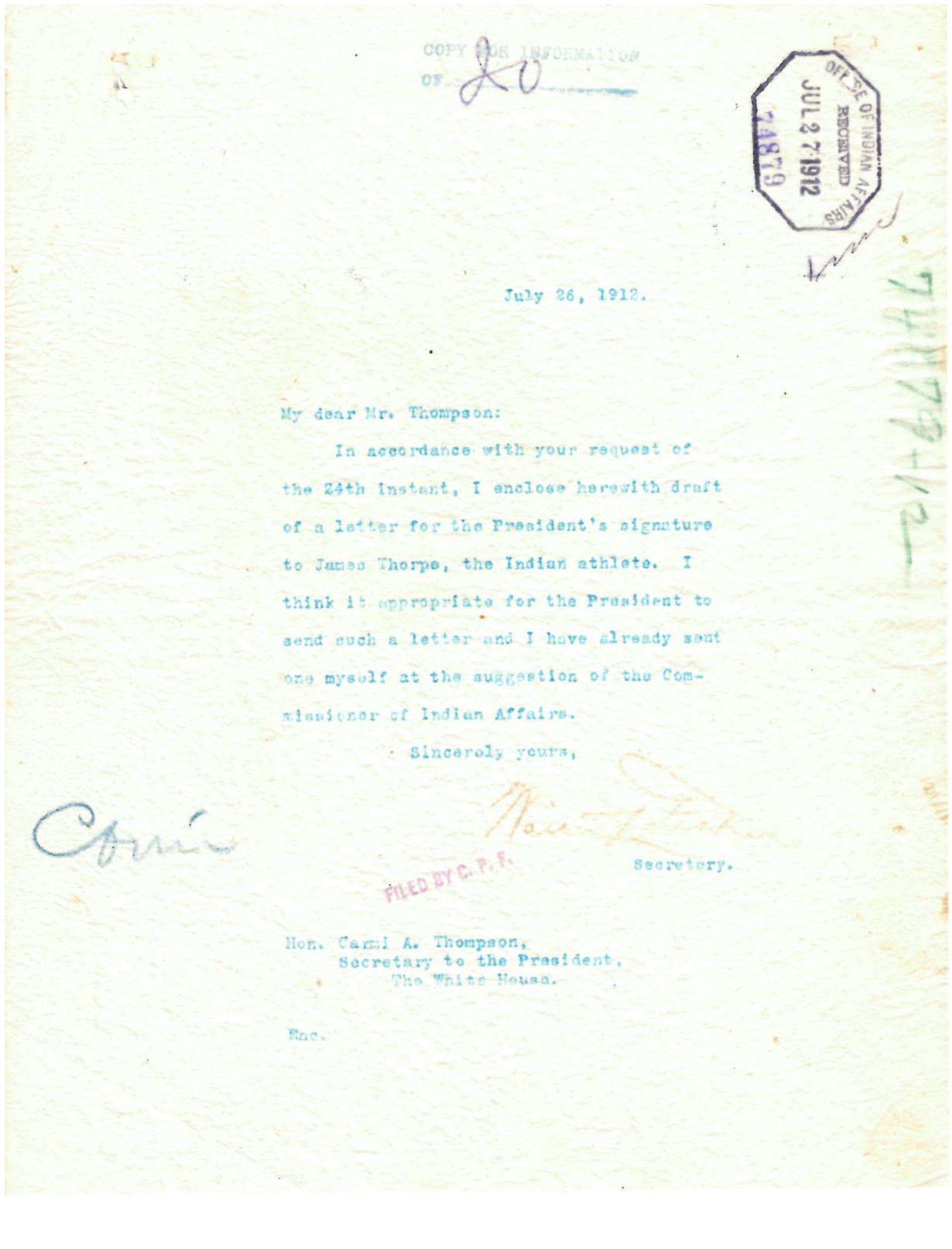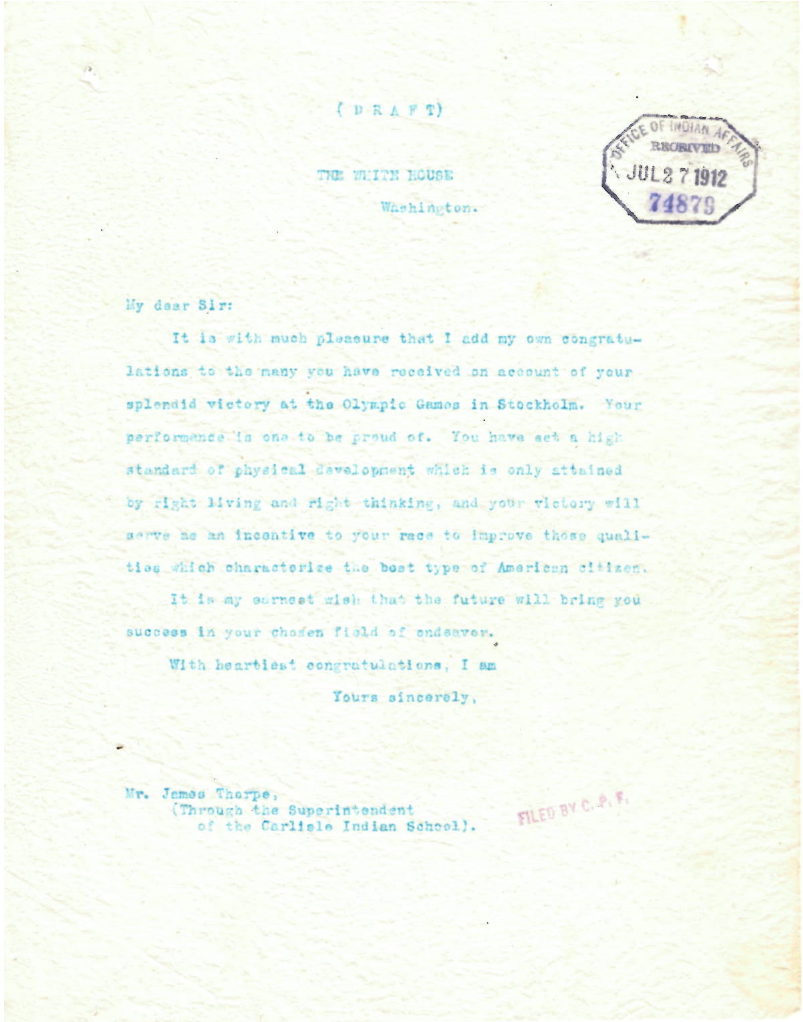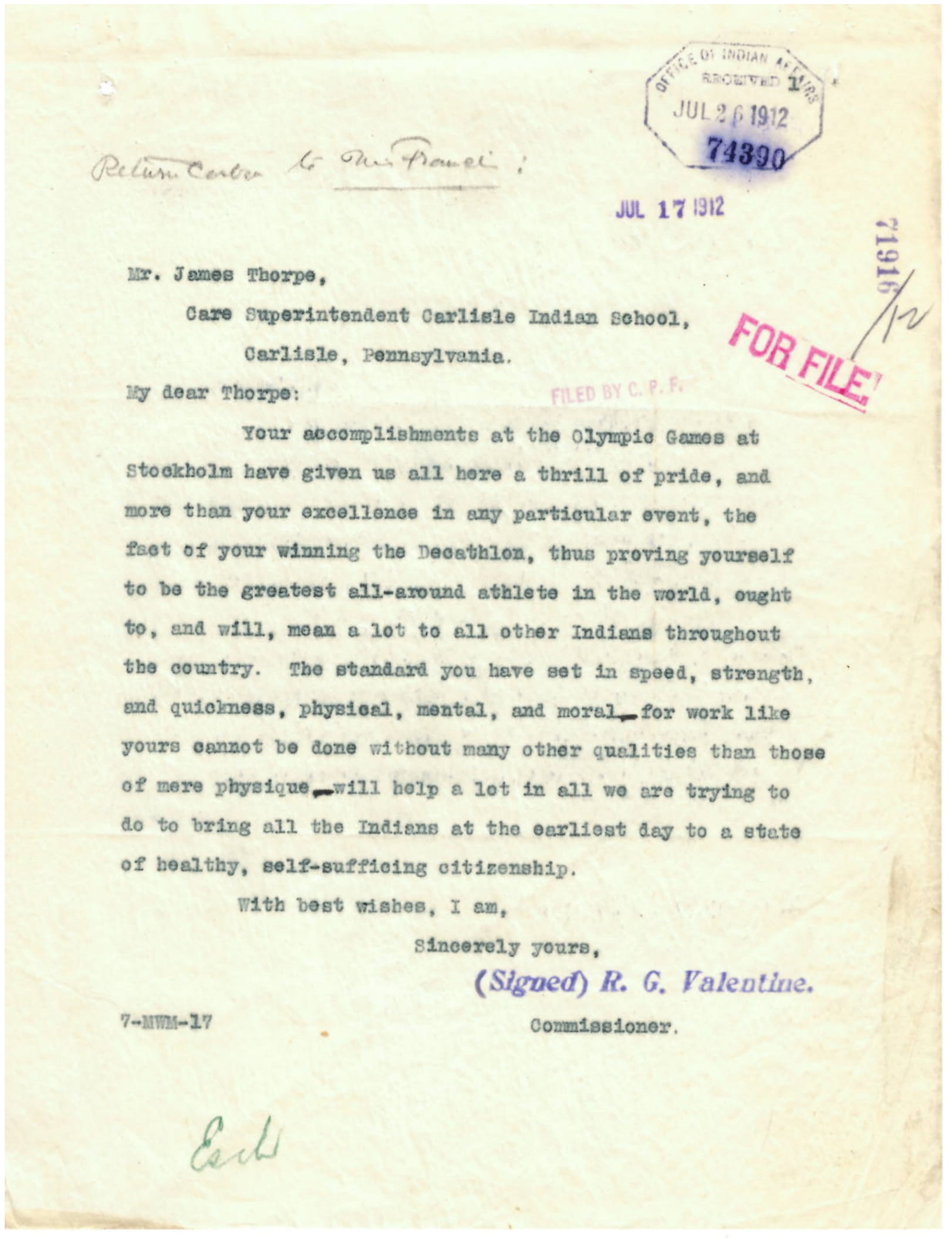 An example is given below. The first index card describes a 1912 letter from the President to James Thorpe congratulating Thorpe on his success at the most recent Olympic Games. The handwritten "filed with" note indicates that the letter has been consolidated with File 71916-1912-047-Carlisle.