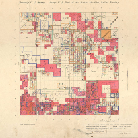 The Dawes allotment maps are printed plat maps of townships that the Dawes Commission annotated to show land allotments of approved members of the Five Civilized Tribes, as well as townsites and railway rights-of-way.