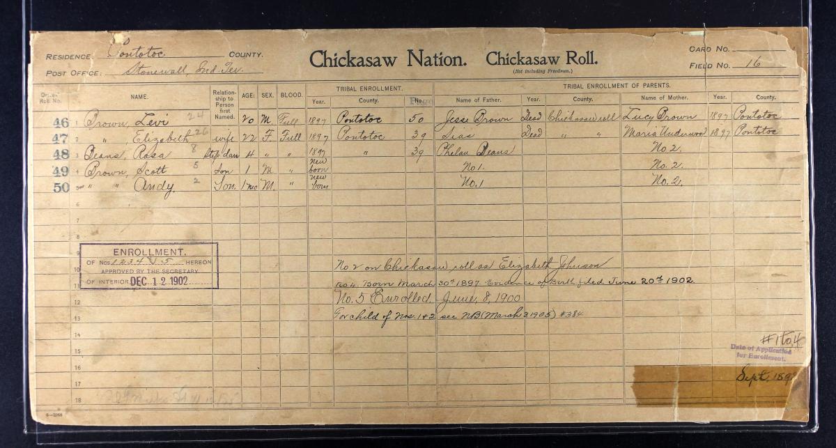 The Final Dawes Rolls include approved and disapproved census rolls created by the Dawes Commission. Approved rolls list individuals who were accepted as eligible for tribal membership in the Cherokee, Choctaw, Chickasaw, Creek, or Seminole Nations (the “Five Civilized Tribes”), including Delaware adopted by the Cherokee, Mississippi Choctaw, and Freedmen (individuals who were formerly enslaved by the Five Civilized Tribes and their descendants). Individuals listed on the approved rolls were entitled to a land allotment. Disapproved rolls list individuals whose enrollment applications were stricken or rejected.