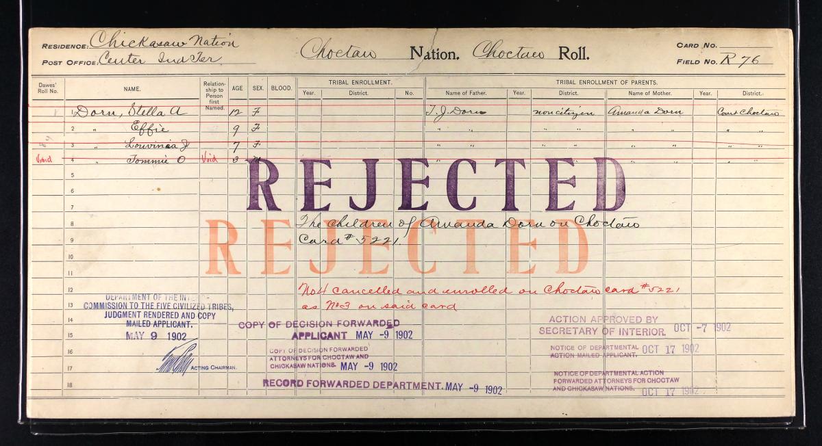This PDF includes an example of a rejected Dawes census card followed by an annotated copy.