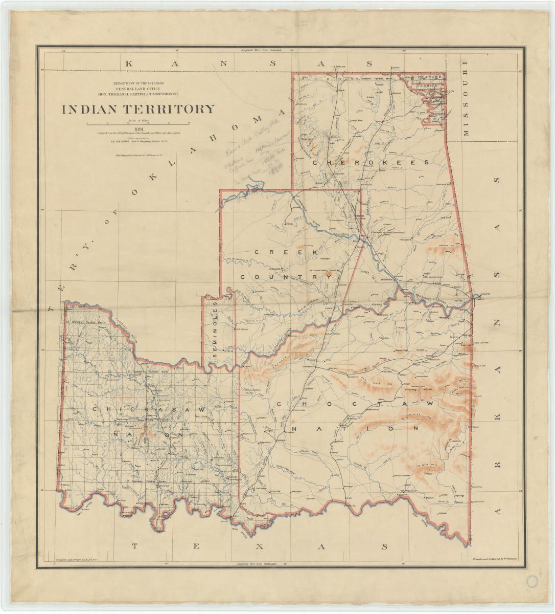 Map of the Cherokee, Choctaw, Chickasaw, Creek, and Seminole Nations in Indian Territory, ca. 1888