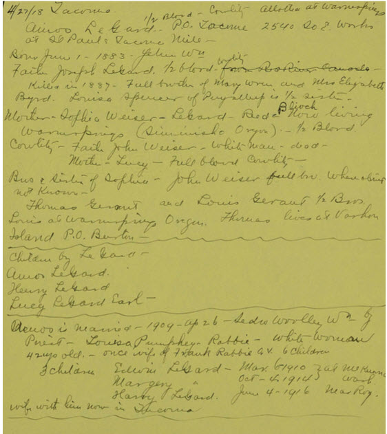 Beginning in 1916, Roblin began compiling a list of claimants. Roblin only included Indians not already appearing on tribal censuses for western Washington. He submitted his final report to the Commissioner of Indian Affairs on January 31, 1919, and included the following: