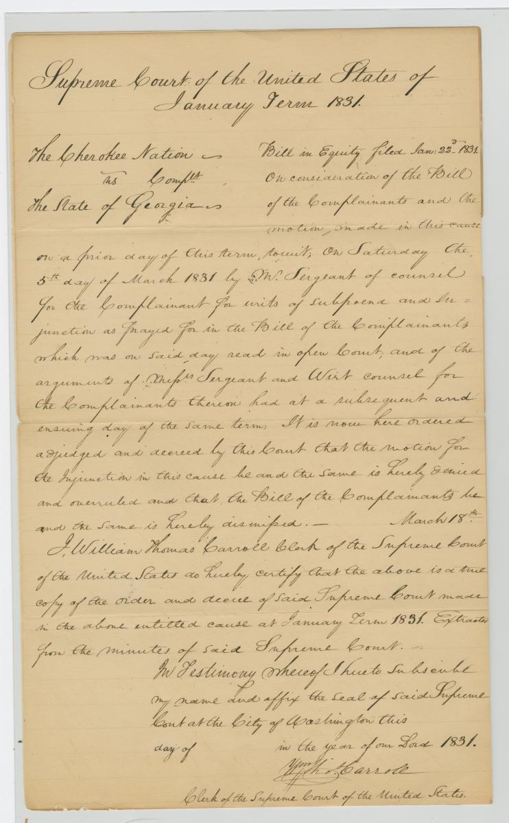 - Cherokee Nation v. State of Georgia, 20 U.S. 1 (1831), National Archives Identifier 38995559
