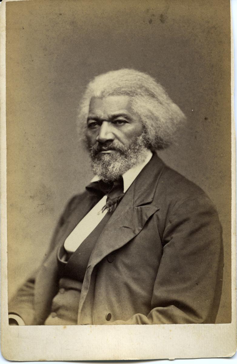 This is a photographic portrait of abolitionist, publisher, writer, and African American civil rights leader Frederick Douglass, taken approximately 1879, when Douglass was in his early 60s. It is a typical example of a cabinet card, which was a common format for photographic portraits in the late 19th century.