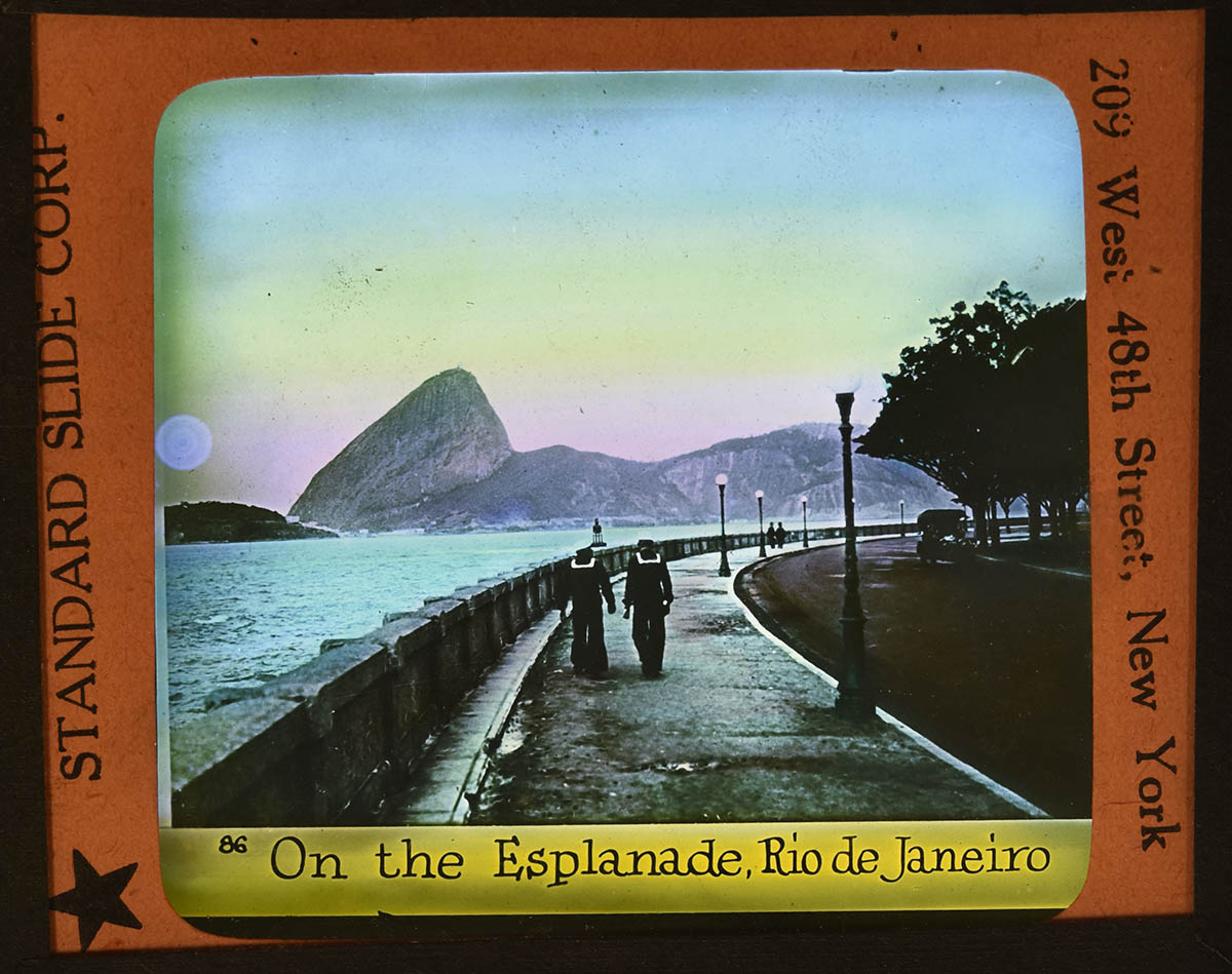 Lantern slides were placed in “magic lanterns,” the forerunner to the popular slide projectors of the second half of the 20th century, and could be projected using a light source. Lantern slides were often grouped as collections focused on a specific subject and as part of presentations, for educational, informational, and entertainment purposes. Captions or titles could be added to the slides to further this. The series “Hand-Colored Lantern Slides Made for Naval Recruiting Purposes ca. 1920” (Local Identifier: 24-RSC, National Archives Identifier: 513154) demonstrates this emphasis on presentations. Each slide includes a caption or title, and the series of slides were likely used to show potential recruits the places they could visit and things they could do if they joined the Navy.