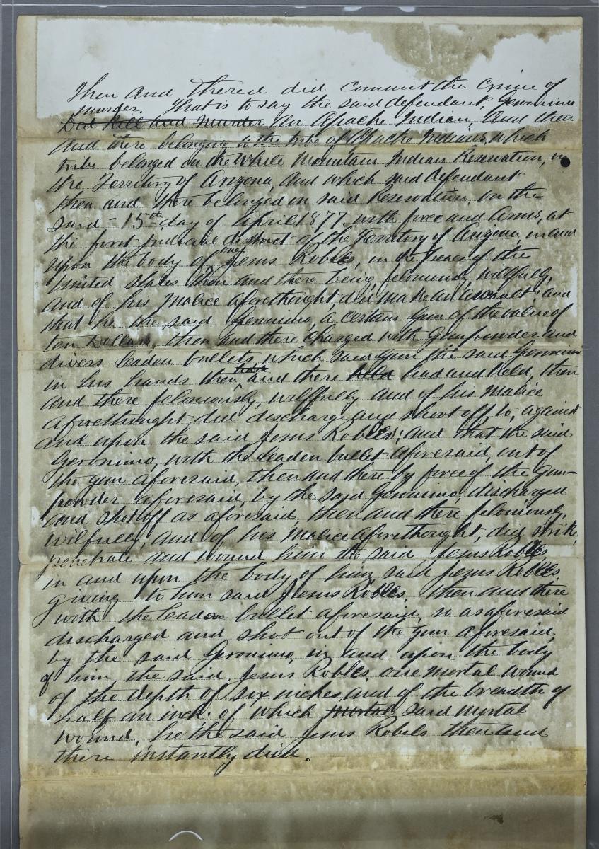 This document is the indictment of Geronimo for the April 15, 1887, murder of Jesus Robles.