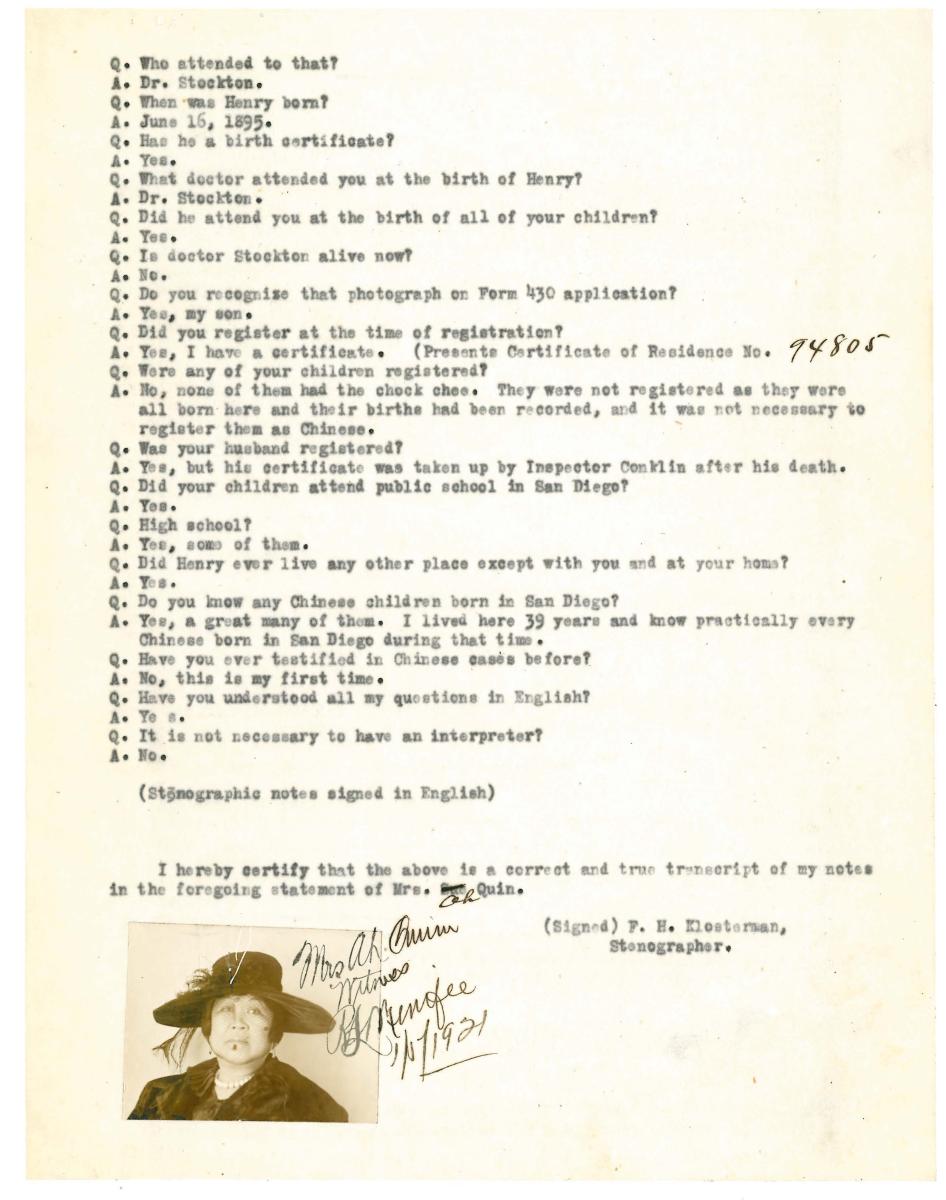 This photograph was attached to the transcript of Leung Shee’s testimony in support of her son Henry Quin’s application to travel to Mexico for business and pleasure. Leung Shee and her husband Tom Ah Quin were prominent founders of early San Diego and well-respected pillars of the community