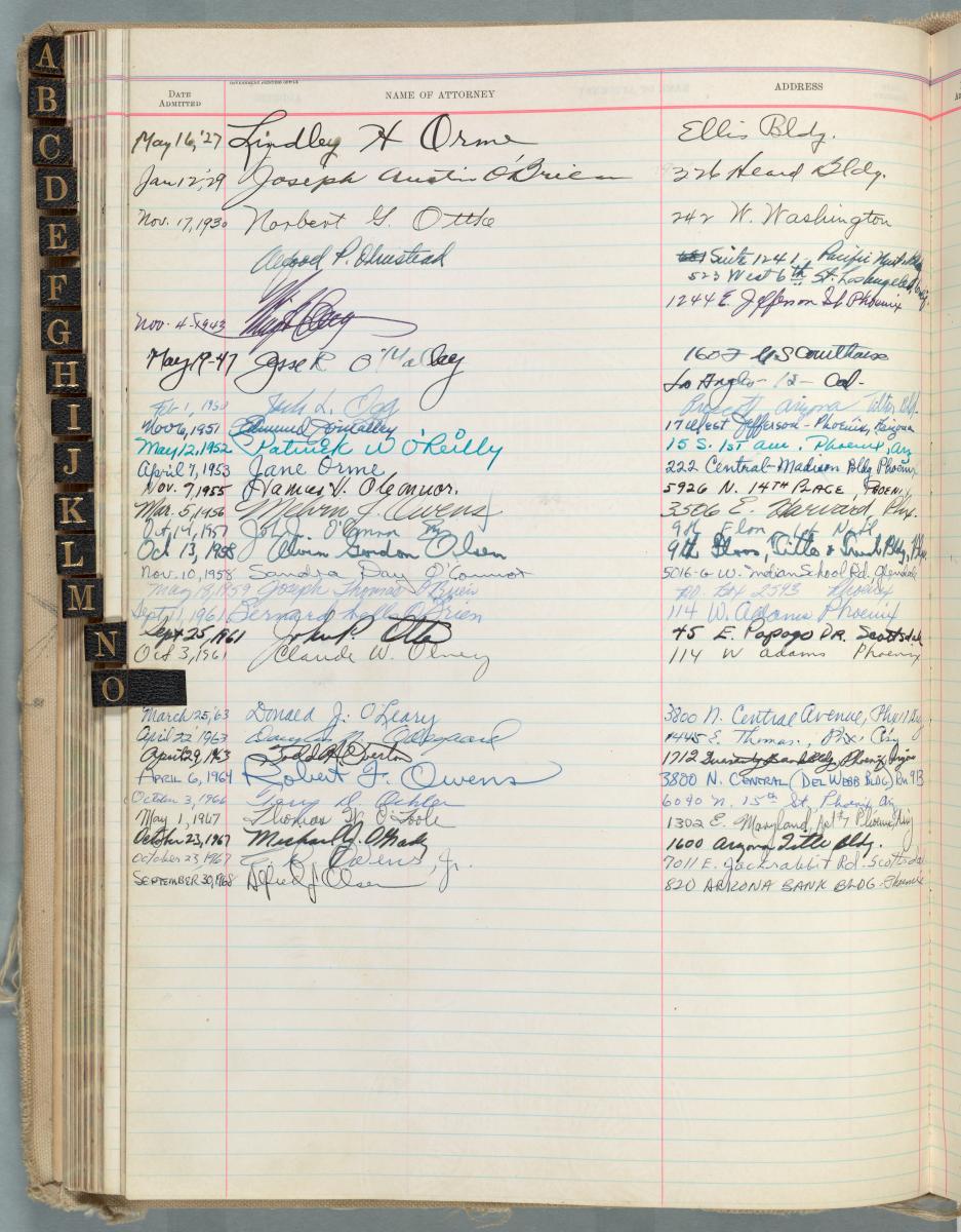 This document is a register of attorneys who were admitted to practice law before the United States District Court for the District of Arizona. The register includes an entry on November 10, 1958, documenting Sandra Day O’Connor’s addition to those who were approved to practice before the court.