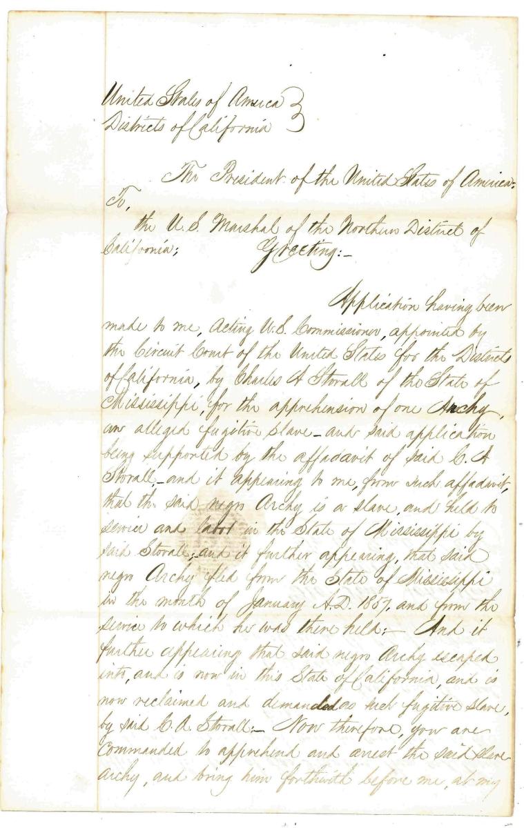Read the full text, view, and download the Warrant of Arrest for Archy Lee and other documents from Stovall v. Archy, a Slave, U.S. Commissioner (San Francisco) on the National Archives Catalog. The National Archives at San Francisco holds nearly 200 cubic feet of U.S. Commissioner’s case files dating from 1855-1971.