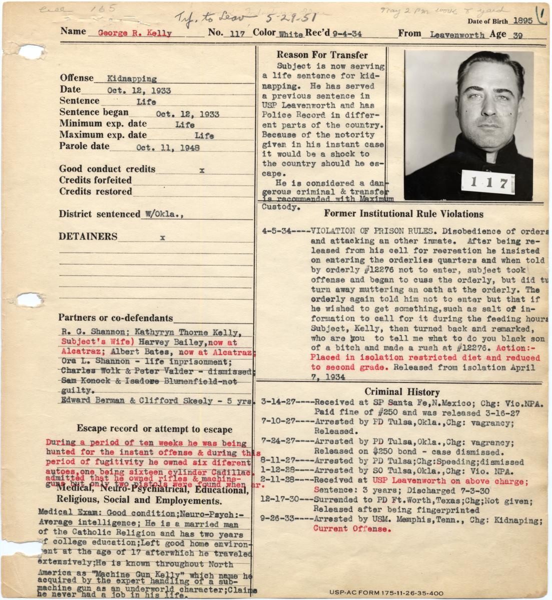 Here we have the page for notorious American gangster George B. "Machine Gun" Kelly who was incarcerated at Alcatraz from 1934-1951.