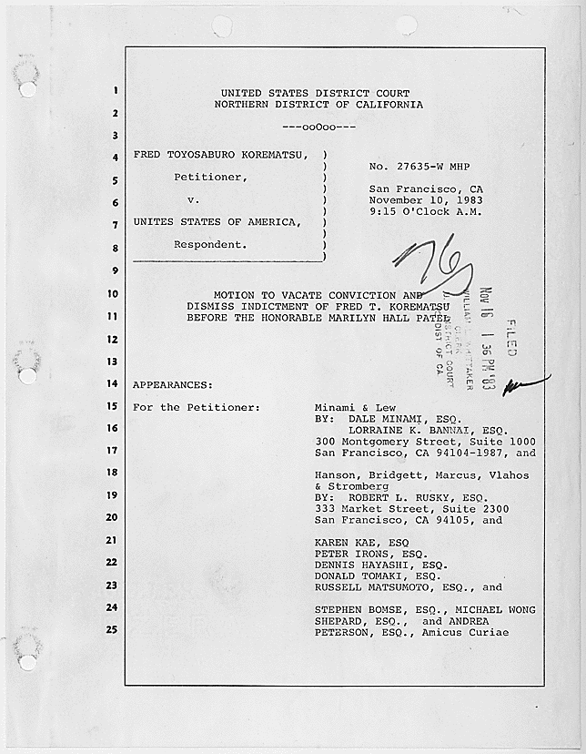Motion to Vacate Conviction and Dismiss Indictment of Fred T. Korematsu, November 16, 1983