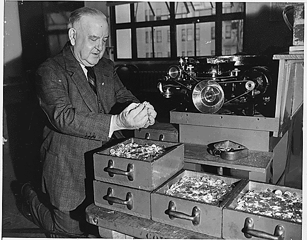 For two months, employees of the San Francisco Federal Mint worked behind the bullet-proof enclosures making more than 10 million coins for the Chinese government. After the mint in Shanghai closed, the Chinese sent 150 tons of silver and copper alloys to San Francisco so that the money could be made. More than three million dollars and twice as many half-dollars were ordered. This photograph shows Peter J. Haggerty, Superintendent of the Mint, looking over part of the production of Chinese coins.